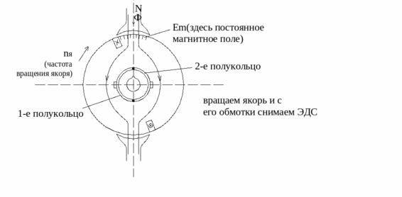 Коллектор переключает одно полукольцо на второе, ток опять идет в одну сторону выпрямитель.