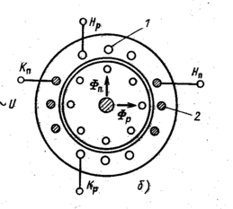 Т.к. переменное поле воздействует и на главные магнитные полюса, то выполняются из шихтованных материалов якорь и наконечник в 2