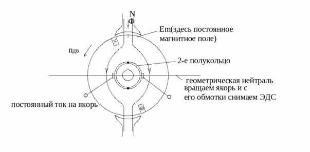 бмотка возбуждения запитывается так же постоянным током, но и в якорь подается постоянный ток