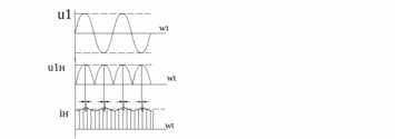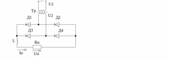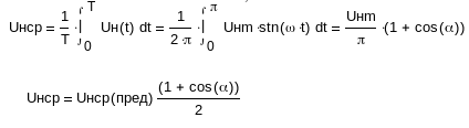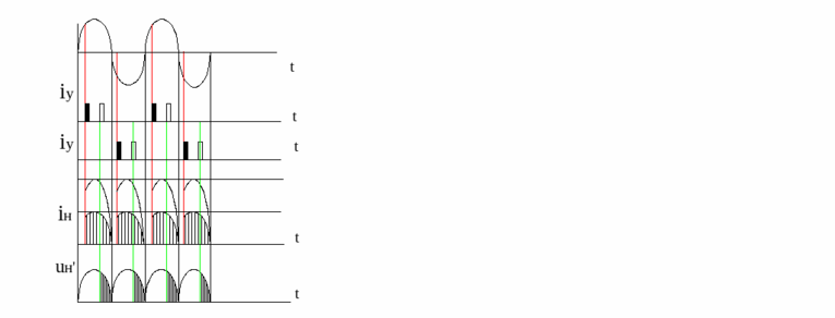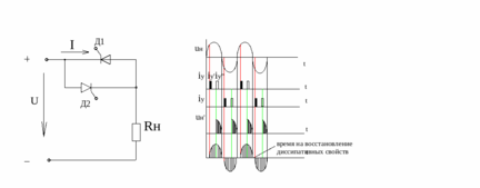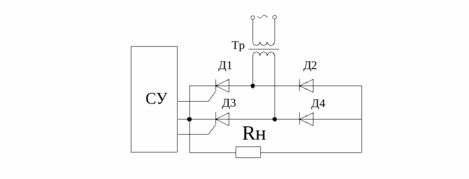 1-ый полупериод 1-ый тиристор Д1, 2-ой полупериод–Д2