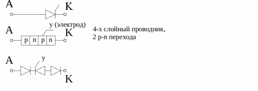 Тиристор- вентиль, через который ток в прямом направлении протекает только в прямом направлении, только при его включении