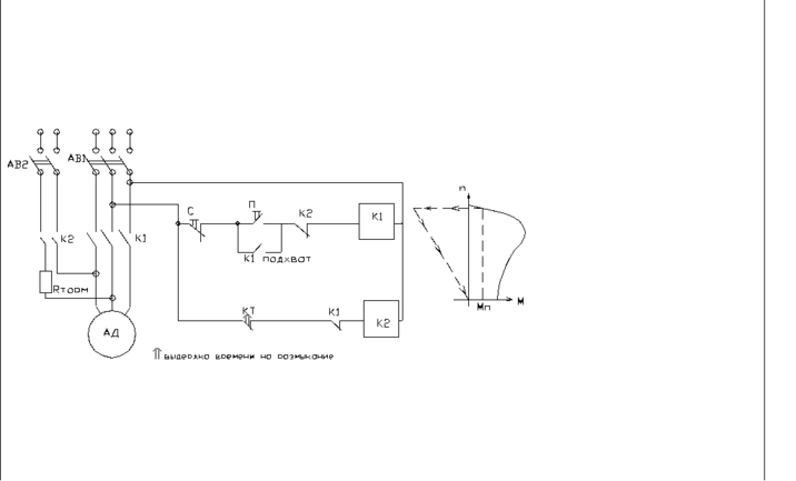 РВ1- реле времени, как только двигатель разогнался включили контакт РВ1 и выключили К1, перешли к РВ2( время идет на разгон до (.)К2 на графике), включили К2 и перешли на естественную характеристику- пуск функции времени.