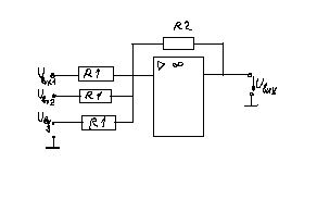Uвых=(Uвх1+Uвх2+Uвх3)R2/R1- суммирующий усилитель.