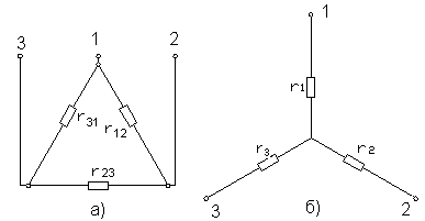 отором конец одного элемента соединяется с началом второго, конец второго- с началом третьего, а конец третьего - с началом первого. Узловые точки 1,2,3 подключаются к остальной