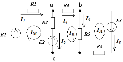 Контурные токи обозначены Iм, Iн, Iл, заданы их направления, как показано на рис.3.