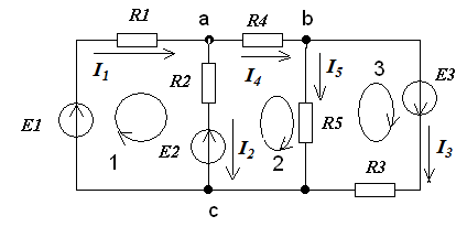 Согласно предложенному алгоритму, определим количество узлов и ветвей схемы рис.2: q = 3, p = 5, следовательно, уравнений по 1-ому закону Кирхгофа равно 2, а уравнений по 2-ому закону Кирхгофа равно 3. Запишем эти уравнения согласно правилам: