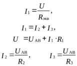 | Rэкв = R1+R2+R3 I = E/R экв U = U1+U2+U3 = R1·I + R2·I + R3·I =Rэкв∙I |