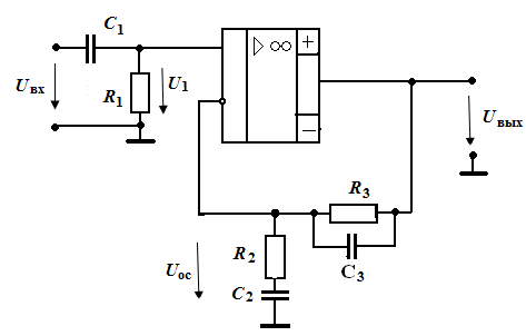 Активный полосовой фильтр – представляет собой четырехполюсник, содержащий активный элемент операционный усилитель (ОУ) и пассивные RC цепи, усиливающий напряжение в заданной полосе частот.