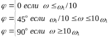 В логарифмическом масштабе диаграмма фазового сдвига может быть представлена тремя отрезками, изломы характеристики соответствуют частотам ωi/10, 10ωi . Её наклон составляет 45о/дек.