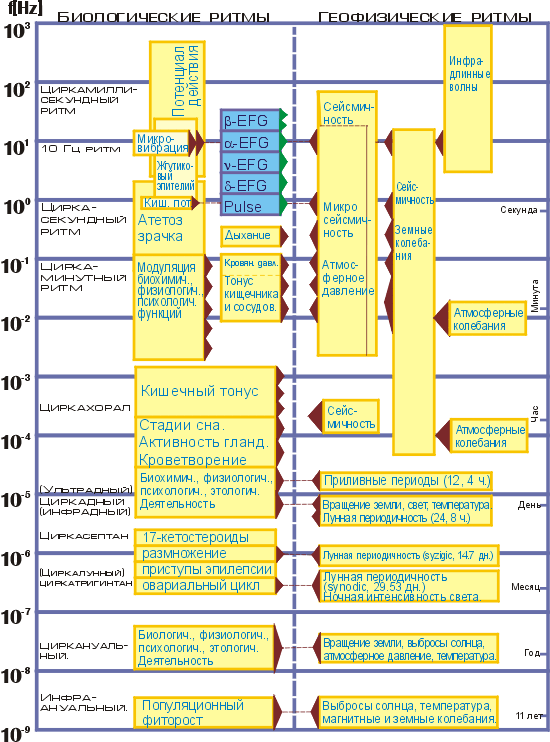 | Рис. 1. Космофизические, геофизические и биологические ритмы. Справа – шкала периодов, слева – шкала частот |
