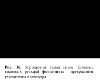 Напомним, что в процесс фотосинтеза входят световой и темновой циклы химических реакций. Первый включает поглощение энергии квантов света и, через ряд промежуточных стадий, приводит к образованию высокоэнергетических восстановленных химических соединений и богатых энергией молекул АТФ. Эти вещества употребляются в темновом цикле (цикле Кальвина), в котором свет непосредственно не участвует. Здесь происходит восстановление углекислоты СО2 с помощью веществ, богатых энергией, и доноров водорода, полученных в световом цикле, и превращение ее в углеводы ‑ фруктозу и глюкозу (рис. 16).
