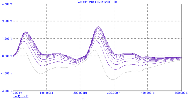 Изучим влияние параметра R2 (определяющий состояние мелких сосудов) на реографическую кривую. Будем изменять этот параметр в диапазоне 500..5000 Ом с шагом 500 Ом. Найдем при каждом значении сопротивления значения параметров α, Ас, Аи, Ад, ДКИ, ДСИ.