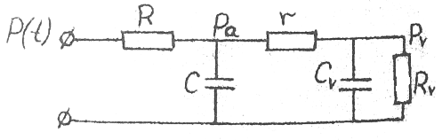 В модели учитываются: крупные и средние артериальные сосуды (гемодинамическое сопротивление R, объемная емкость С), мелкие резистивные сосуды (гемодинамическое сопротивление r), венозные сосуды (сопротивление Rv и емкость Cv). На входе в сосудистое русло сегмента имеется давление P(t).