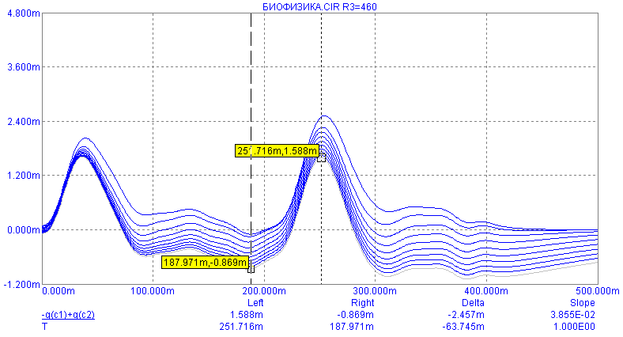 Изучим влияние параметра R3 на реографическую кривую. Будем изменять этот параметр в диапазоне 10..500 Ом с шагом 50 Ом. Найдем при каждом значении сопротивления значения параметров α, Ас, Аи, Ад, ДКИ, ДСИ.