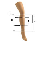 Рис.1 Тетраполярный метод РПГ. Выбираем соотношение l/L<0.6. При этом точность измерений объема крови в сегменте конечности не ниже 15%.