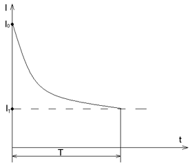 Зависимость величины тока от времени: I=(U-E(t))/R, U- приложенное напряжение, E(t) – возникающее противодействующее ЭДС, R – сопротивление.