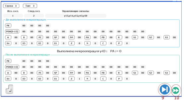 Перемотка в конец программы осуществляется с помощью кнопки 10. Перемотка возможна только до 1000-го такта. Если программа выполняется циклически или содерит слишком большое количество тактов, после 1000-го такта можно воспользоваться пошаговым выполнением.