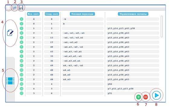 Буквы “x” и “y” набираются на английской раскладке клавиатуры. Количество запятых и пробелов в полях Условия перехода и Управляющих сигналы не ограничено , строка будет автоматически приведена к правильному формату. Также допускается использование верхнего регистра, который будет автоматически изменен на нижний.