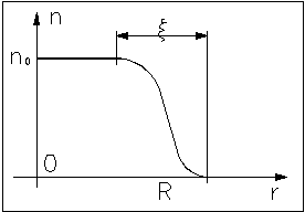 Профиль плотности - размытые ступеньки, в сердцевине - постоянная концентрация звеньев n0. Для данного графика R~N1/3,