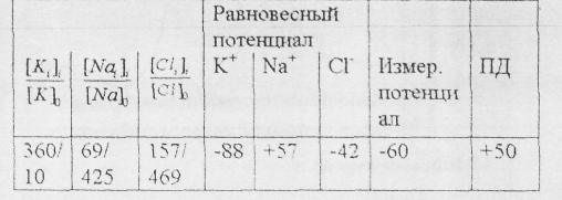 Имеет место примерное равенство концентраций положительных и отрицательных ионов. С другой стороны, т.к. мембрана проницаема для ионов, между концентрациями внутри и снаружи клетки, для равновесия выполняется условие Нернста:
