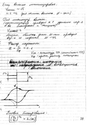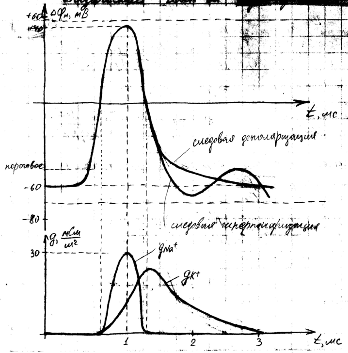 ПД возникает в результате изменения проницаемости (проводимости) мембраны. При этом общее сопротивление (импеданс) мембраны уменьшается. Ранее мы видели, что для ионов K+ и Сl- равновесный нерстовский потенциал отрицателен, и только для Na+, он положителен => положительное значение ПД в его максимуме можно объяснить повышенной проницаемостью для Na. Однако, дальнейшее, снижение ПД к отрицательным значениям можно объяснить, повышением проницаемости для K+ и снижением проницаемости для Nа+. Именно этот механизм экспериментально подтвержден.