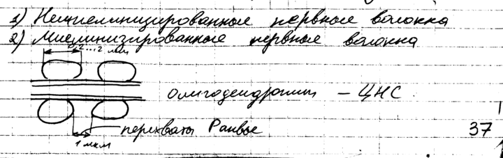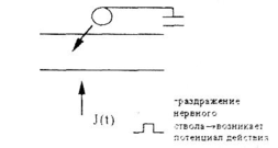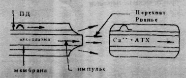 В миелинеаризированных нервных волокнах потенциал действия возникает исходно на мембране, затем по нервному волокну до перехвата Ранвье. Распространяется чисто электрическим путем по следующему участку волокна до следующего перехвата.