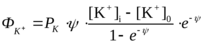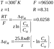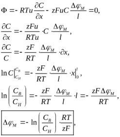 Поскольку общий ток Jобщ = 0, то записываются уравнения потоков и решаются относительно клеточного потенциала. С помощью уравнения электродиффузии записываем выражения для каждого из потоков, подставляем в уравнение (1) и решаем относительно безразмерного клеточного потенциала.