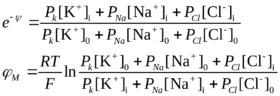 - уравнение стационарного мембранного потенциала (Гольдмана). Оно переходит в уравнение Нерста при условии, что проницаемость для какого-то иона выше, чем для других. Для состояния покоя аксона кальмара Рк:РNa:PCl= 1:0,04:0,45