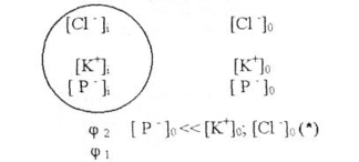 усть имеется внутри и вне клетки только одновалентные катионы К+ (Na+, К+ и т. д.) и анионы Сl- (только в основном) а также присутствуют макромолекулы одного copтa, которые заряжены отрицательно и имеют N центров связывания одновалентных ионов [Р-] - белки (все в основном заряженные отрицательно) .