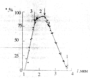 Рис. Схема зависимость напряжения (♦), развиваемого при изометрическом тетаническом сокращеии изолированного мышечного волокна полусухожильной мышцы лягушки, от длины саркомеров (1) (Хаксли А., 1971). Цифры над стрелками обозначают состояния саркомеров, изображенных на рис.1.