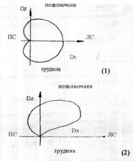 C, ЛС - правая и левая стороны. Графики называются плоскими кардиограммами (1) - здоровый человек, (2) - больной человек.