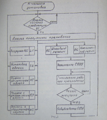 IFS - команда условного перехода – реализуется условно переход в зависимости от сигнала RDY0, которым является ответный сигнал платы звуковой сигнализации. В момент передачи звукового сигнала RDYO = 0, в режиме молчания RDYO = I. Команда трехбайтная, ее структура следующая: 1-й байт - код команды; 2-й байт - адрес AI, если: RDYO = I; 3-й байт - адрес А2, если RDYO = 0.