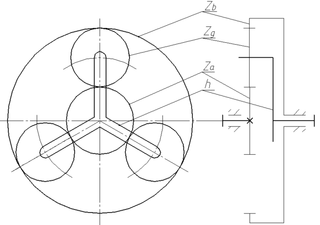 Принцип работы планетарных передач: при закрепленном колесе zb (b=0) вращение колеса za (a=0) вызывает вращение сателлита zg относительно собственной оси со скоростью g. Качение сателлита по zb перемещает его ось и вращает водило со скоростью h.