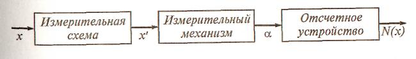 Измерительная схема электромеханического прибора содержит совокупность сопротивлений, индуктивностей, емкостей и других элементов электрической цепи прибора и осуществляет количественное или качественное преобразование входной величины х в электрическую величину х', на которую реагирует измерительный механизм. Механизм преобразует электрическую величину х в механическое угловое или линейное перемещение а, значение которого отражается на шкале отсчетного устройства прибора, проградуированной в единицах измеряемой величины N(x). Для этого необходимо чтобы каждому значению измеряемой величины соответствовало одно и только одно, определенное отклонение