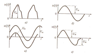 Измеряемые на практике напряжения могут иметь различный вид, например, форму импульсов, синусоидального или не синусоидального колебаний — суммы синусоиды с постоянной составляющей и т.д. (см. рис. З.1, а, б, в). При разнополярных несимметричных кривых формы напряжения различают два амплитудных значения (см. рис. 3.1, г): положительное Um+ и отрицательное Um-.