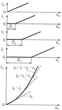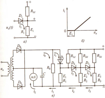 В схеме, представленной на рис. 3.7, в, первоначально диоды D1, D2, D3 закрыты соответствующими напряжениями смещения Е1, Е2, Е3, и при малом входном напряжении ux(t) ток через миллиамперметр равен i0. Когда входное напряжение ux(t) > Е1 откроется диод D1 и параллельно резистору R0 подключится делитель напряжения R1, R1c. В результате крутизна вольтамперной характеристики на участке от Е1 до Е2 возрастает; суммарный ток протекающий через миллиамперметр, станет равным i