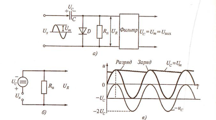 Изменение напряжения на сопротивлении нагрузки Rн определяется разностью амплитуды входного напряжения Uх и напряжения на конденсаторе Uс, т.е. UR = Uх - Uс Таким образом, выходное напряжение UR будет пульсирующим с удвоенной амплитудой измеряемого напряжения, как показано на рис. 3.6, в. Это подтверждают простые математические выкладки: