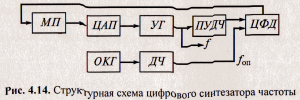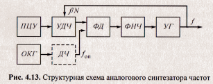 На рис. 4.13 показана структурная схема аналогового синтезатора частоты с цифровым управлением, в которую входит опорный кварцевый генератор ОКГ, управляемый делитель частоты УДЧ, управляемый генератор УГ, фазовый детектор ФД с цепью фазовой автоматической подстройки частоты и программируемое цифровое устройство ПЦУ.