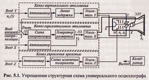 Рассмотрим упрощенную структурную схему универсального осциллографа, приведенную на рис. 5.1. В схеме этого осциллографа кроме ЭЛТ можно выделить следующие функциональные блоки: каналы вертикального и горизонтального отклонений, устройство синхронизации и запуска развертки, канал модуляции луча, вспомогательные устройства, источник питания. В осциллографе исследуемый электрический сигнал подают через канал вертикального отклонения на вертикально отклоняющую систему ЭЛТ, а горизонтальное отклонение электронного луча трубки осуществляют напряжением горизонтальной развертки.