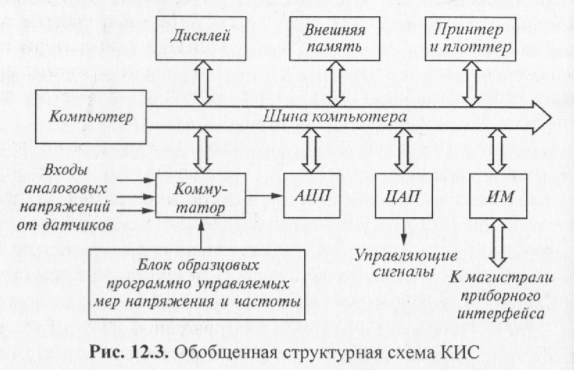 Взаимодействие между отдельными элементами КИС осуществляют с помощью внутренней шины компьютера, к которой подключены как его внешние устройства (дисплей,внешняя память, принтер, плоттер), так и измерительная схема, состоящая из коммутатора, АЦП и блока образцовых программно-управляемых мер напряжения и частоты. С помощью ЦАП можно вырабатывать управляющие аналоговые сигналы; интерфейсный модуль ИМ подключает измерительный прибор к магистрали приборного интерфейса. Коммутатор устройства обеспечивает подачу аналоговых напряжений с внешних датчиков на узлы системы. Достаточно простые узлы КИС можно разместить на одной плате персонального компьютера. Существуют и более сложные структуры КИС, в которых в соответствии с решаемой измерительной задачей по установленной программе меняют архитектуру построения системы.