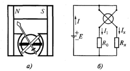 Уменьшить влияние источника питания Е на точность измерения активных сопротивлений позволяет применение магнитоэлектрического прибора — логометра, встречающегося в лабораторной измерительной практике. Устройство и схема включения магнитоэлектрического логометра представлены на рис. 10.2.