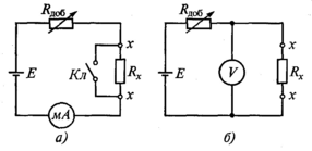 Для измерения небольших сопротивлений (0,01... 100 Ом) используют схему с вольтметром (рис. 10.1, б). Показания вольтметра определяют по формуле: