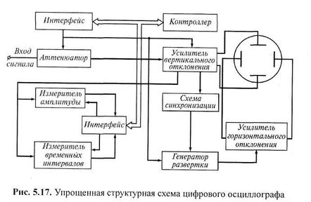 Структурная схема цифрового осциллографа содержит: аттенюатор входного сигнала; усилители вертикального и горизонтального отклонения; измерители амплитуды и временных интервалов; интерфейсы сигнала и измерителей; микропроцессорный контроллер; генератор развертки; схему синхронизации и электроннолучевую трубку.