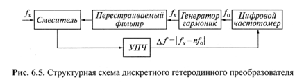 диапазоне СВЧ-колебаний гетеродинный метод измерения частоты применяется совместно с цифровыми методами. Расширение предела измерения до 10...12 ГГц достигается за счет переноса (преобразования) измеряемой частоты в область более низких частот. Такой перенос можно осуществить, например, с помощью дискретного гетеродинного преобразователя частоты, структурная схема которого вместе с цифровым частотомером приведена на рис. 6.5.