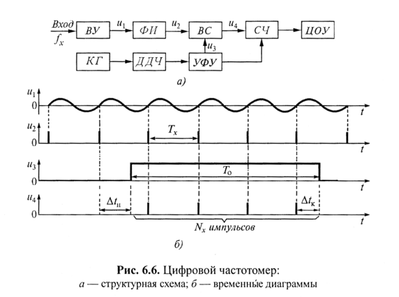 Принцип измерения частоты гармонического сигнала цифровым методом поясняет рис. 6.6, где приведены структурная схема цифрового частотомера, работающего в режиме измерения частоты, и временные диаграммы к его работе.