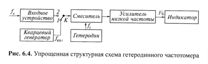 Гетеродинный метод является одной из разновидностей методов сравнения измеряемой частоты fx с частотой эталонного генератора — гетеродина. Этот метод использует принцип построения измерительных схем с нулевыми биениями. Упрощенная структурная схема гетеродинного частотомера представлена на рис. 6.4. Она содержит: входное устройство, кварцевый генератор, смеситель, гетеродин, усилитель низкой частоты и индикатор (нулевых биений). Действие гетеродинного частотомера сводится к простому принципу: при переводе ключа К в положение 1 производят калибровку шкалы гетеродина; при положении 2 — измерение частоты fx, подаваемой на входное устройство.