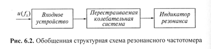 Перестраиваемая колебательная система через входное устройство возбуждается сигналом источника измеряемой частоты u(fx). Интенсивность колебаний в колебательной системе резко увеличивается в момент резонанса, т.е. при fx = fр. Данный момент фиксируется индикатором резонанса, связанного с колебательной системой, и значение измеряемой частоты fx считывается с градуированной шкалы механизма настройки. В качестве колебательной системы на частотах до сотен мегагерц используют колебательные контуры; на частотах до 1 ГГц — контуры с распределенными параметрами (отрезки коаксиальной линии); на частотах свыше 1 ГГц — объемные резонаторы.