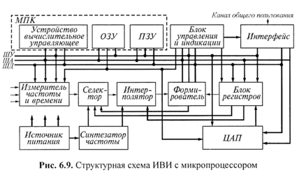 Структурная схема цифрового измерительного прибора с микропроцессорным контроллером представлена на рис. 6.9. Схема ИВИ содержит следующие блоки: измеритель частоты и интервалов времени, интерполятор, селектор, формирователь, блок регистров, ПАП, синтезатор частоты (выполнен в виде кварцевого генератора с последующим умножением частоты), микропроцессорный контроллер МПК, интерфейс, блоки управления и индикации, источник питания. Микропроцессорный контроллер является основой прибора и включает в себя устройство вычислительное управляющее, ОЗУ и ПЗУ.