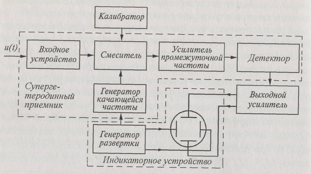 На рис. 9.3 показана упрощенная структурная схема анализатора спектра последовательного типа. Анализатор содержит супергетеродинный приемник, индикаторное (чаще осциллографическое) устройство и калибратор.