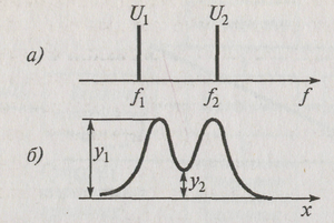 С выхода УПЧ радиоимпульсы подают на амплитудный детектор. На выходе амплитудного детектора образуются видеоимпульсы ид (рис. 9.4, д), поступающие через выходной усилитель на вертикально отклоняющие пластины ЭЛТ. На горизонтально отклоняющие пластины ЭЛТ подают пилообразное напряжение генератора развертки, в результате чего на экране осциллографа появляются видеоимпульсы, изображающие спектр исследуемого сигнала в течение одного периода развертки Тр = Та. Диаграммы на рис. 9.4 построены при условии, что разность частот соседних составляющих спектра много больше полосы пропускания УПЧ, при этом возможна сравнительно малая статическая разрешающая способность (т.е. большой интервал частот Δfp). На практике допускают некоторое перекрытие изображений гармоник (рис. 9.5).